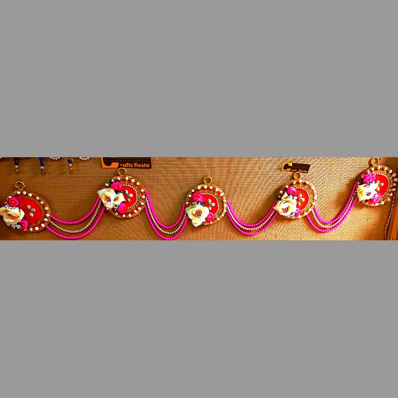 A 105 cm x 18cm x 8cm jute clad on 5 MDF circles with white floral decoration on its circumference, all interlinked with pink beads lines and whilte lines, extendable