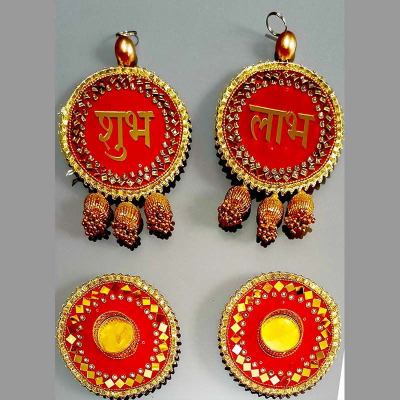 A 30cmx10cmx7cm pair of beautiful hangings and tealight lamps on golden embroidary patch clad MDF, decorated with pearl bangles, golden mirror acrylic Lotus shape , in premium pastel violet vnyle background on strong MDF base in lotus shape, with golden rings, balls, bells in hangings