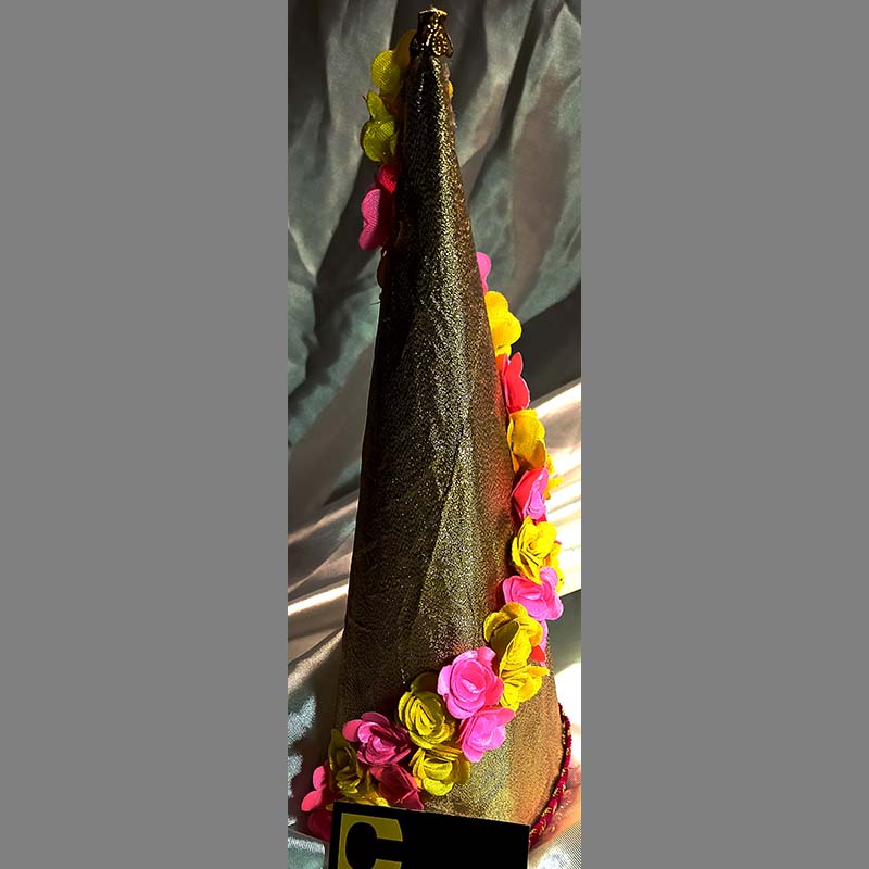 A 15cm x 15cm x 60cm pyramid shaped green decorative packaging loaded with ouspicious sugar sweets gifted as a good omen during pre wedding. This packaging is made of stiff cardboard clad with fine velvet fabric decorated with kundan, beads, ballchain, laces patches.
