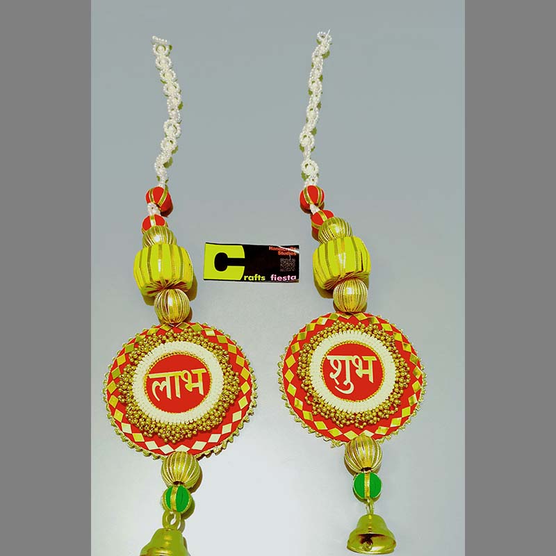 A 45cmx20cmx4cm pair of beautiful hangings with parrot that is an Indian wellness symbol in embroidery patch on the base of 3 pearl wrapped bangles clad with golden fabric, decorated with golden lace bangles, yellow and pink flowers, leaves, polens, pearl bunches.