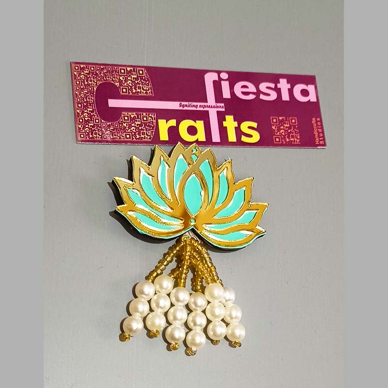 A 6 cm x 6cm golden mirror acrylic Lotus themed brouch , in premium pastel green vnyle background on strong MDF base and 6 cream white pearl hangings, with golden metal pin