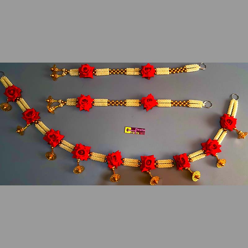 A 105cm x 10cm x 5cm set of red Worship place door top and sides decoration, made from cream pearl bunches making retangular formation and similar golden pearl bunches, with bright red velvet roses at equal distance, with gold plaited plastic bells at hangings end