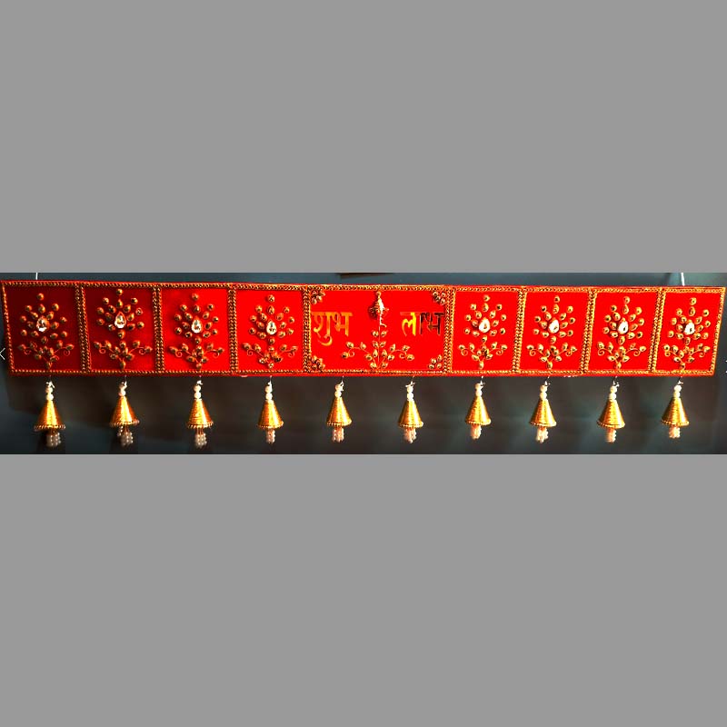 A 60cm x 60cm x 15cm stainless steel puja aarti set for wellness, pious religious rituals, painted with red oil paint, decorated with beads, golden and colored ballchain, diamonds, mirror work, pearls, creating eye catching harmonial patterns, all coated with resin epoxy for shine, durability and easy maintainence, perfect to add value to special spaces in