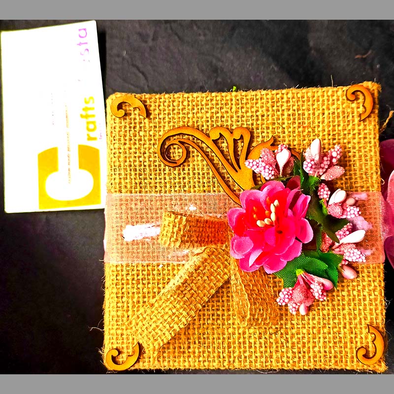 A 10cm x 7 cm x 5cm golden mirror acrylic lasercut trunk shaped box decoration with flowers, pollens, lace, bow . Suitable for packing a small gift