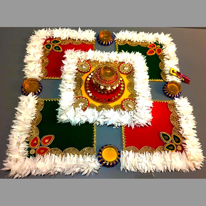 A floor cum wall decoration rangoli set 60cm x 60cm x 8cm made of 5 uniquely decorated square MDF base with yellow center piece, velvet masked, mirror tikki laces, contrast colored embroidery patches, with fabric white lily garland line as border, all in combination of green, red and yellow.4 tealights decorated with laced bangles for its border decor and a 7cm high drum themed tealight with dangling seashells for the center piece.