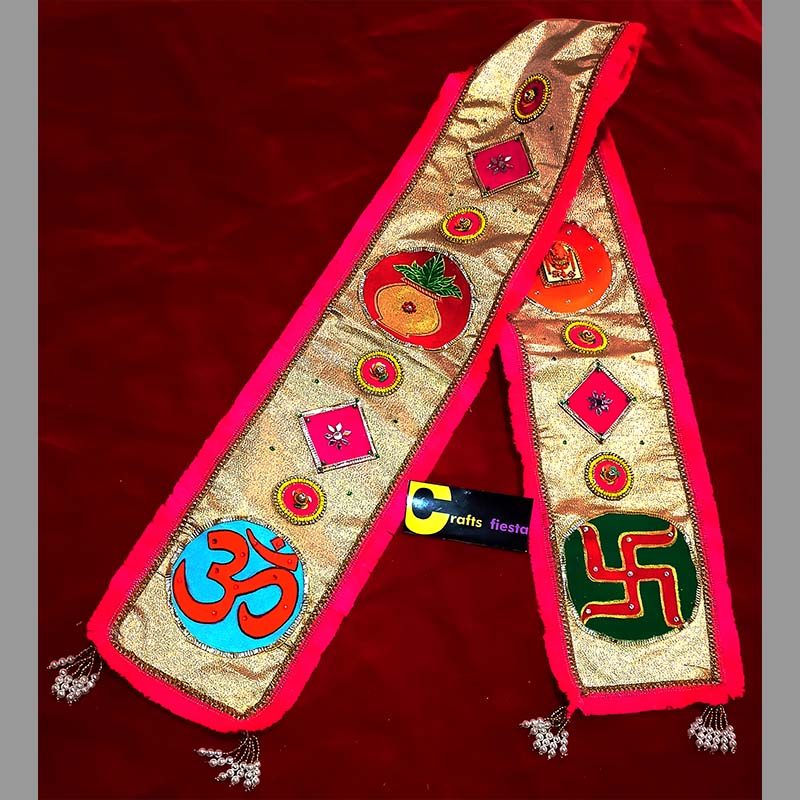 A 240cm x 15cm x 1cm golden fabric pink lace stole with Sanatani ospicious symbols, to be used by bride’s mother in auspicious Indian Sanatani wedding rituals